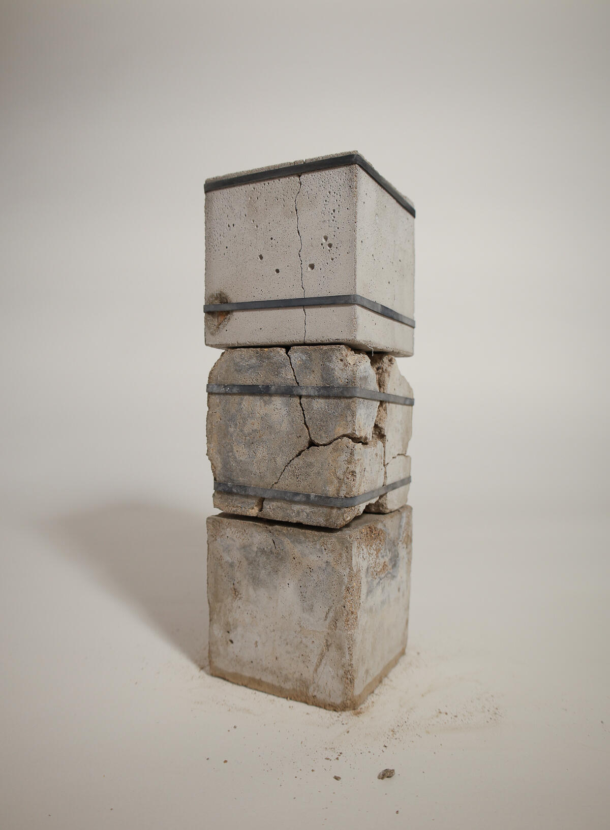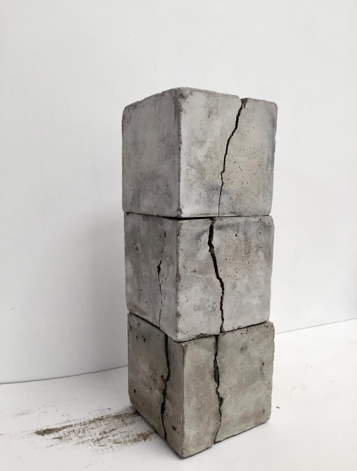 Mixed media time-based sculpture/performance"Breaking Point" consists of a series of cast concrete cubes that gradually fracture and collapse over several hours in front of the audience. The breaking is triggered through the use of d a slow-reacting chemical substance that exerts internal pressure until the structure gives way.Each cube follows its own rhythm of failure—determined by the density, casting process, and unseen tensions within the material. The sculptures perform their own undoing, cracking apart in real time without external force.This work speaks to the quiet drama of inner rupture—the moment before collapse, the sound of slow yielding. It plays with the illusion of solidity, drawing attention to how materials (and perhaps people) hold until they no longer can.Breaking Point is as much about disintegration as it is about presence: a meditation on pressure, endurance, and the inevitability of transformation.
